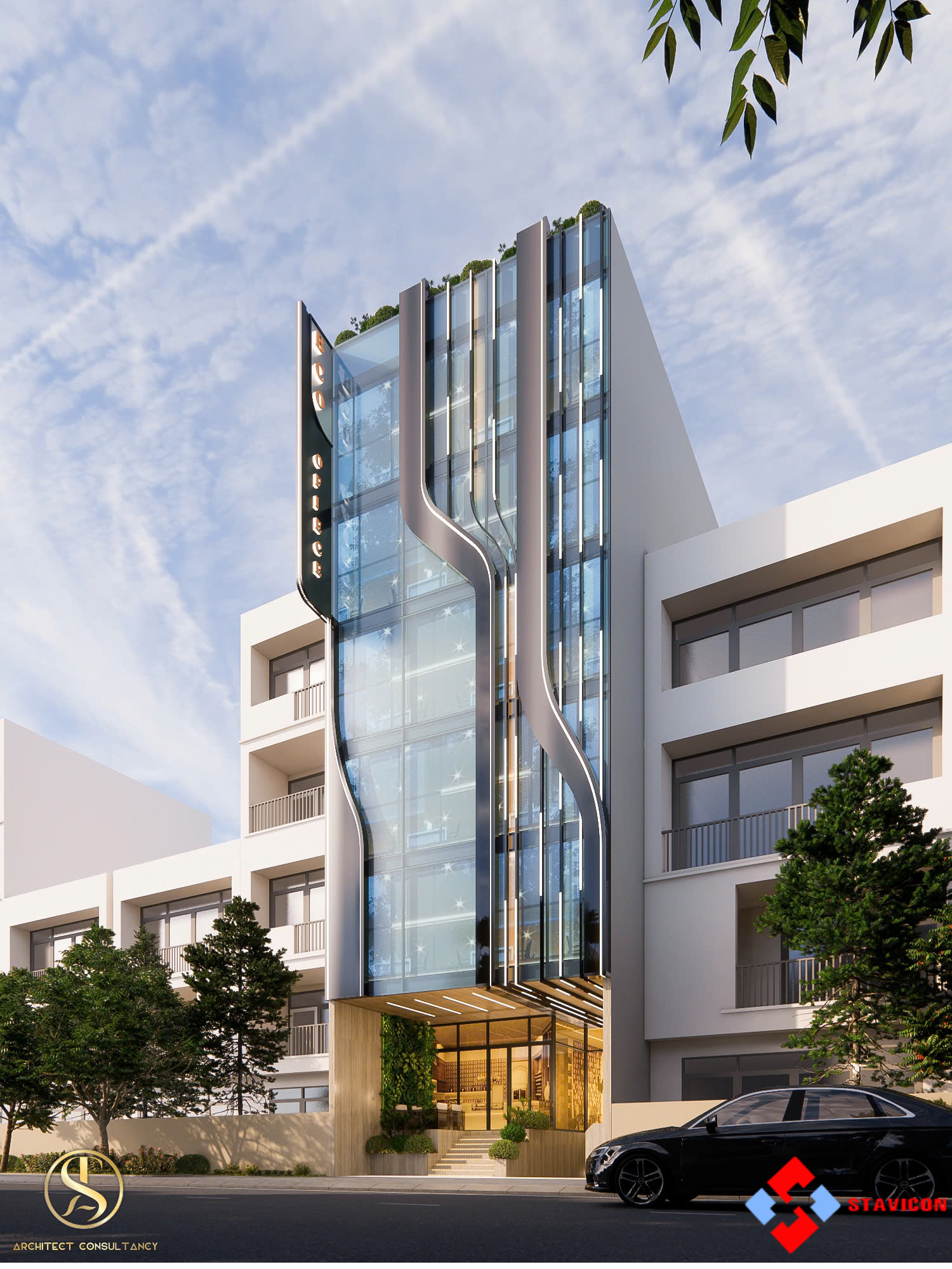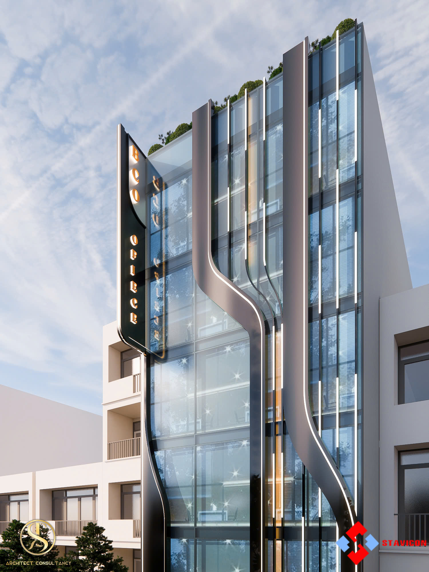 Dự án nổi bật với thiết kế mặt dựng kính uốn lượn độc đáo, vừa mang tính biểu tượng, vừa tối ưu khả năng đón ánh sáng tự nhiên. Ngôn ngữ kiến trúc hiện đại giúp tòa nhà trở thành điểm nhấn nổi bật trên tuyến phố, đồng thời tạo nên không gian làm việc thông thoáng, truyền cảm hứng sáng tạo cho đội ngũ nhân sự.